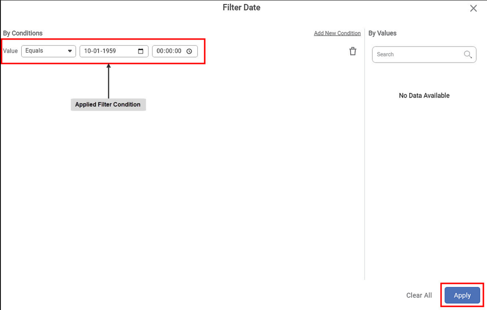 Refer to the table Dataset Filter Options. - From the listed options, select the required condition.
