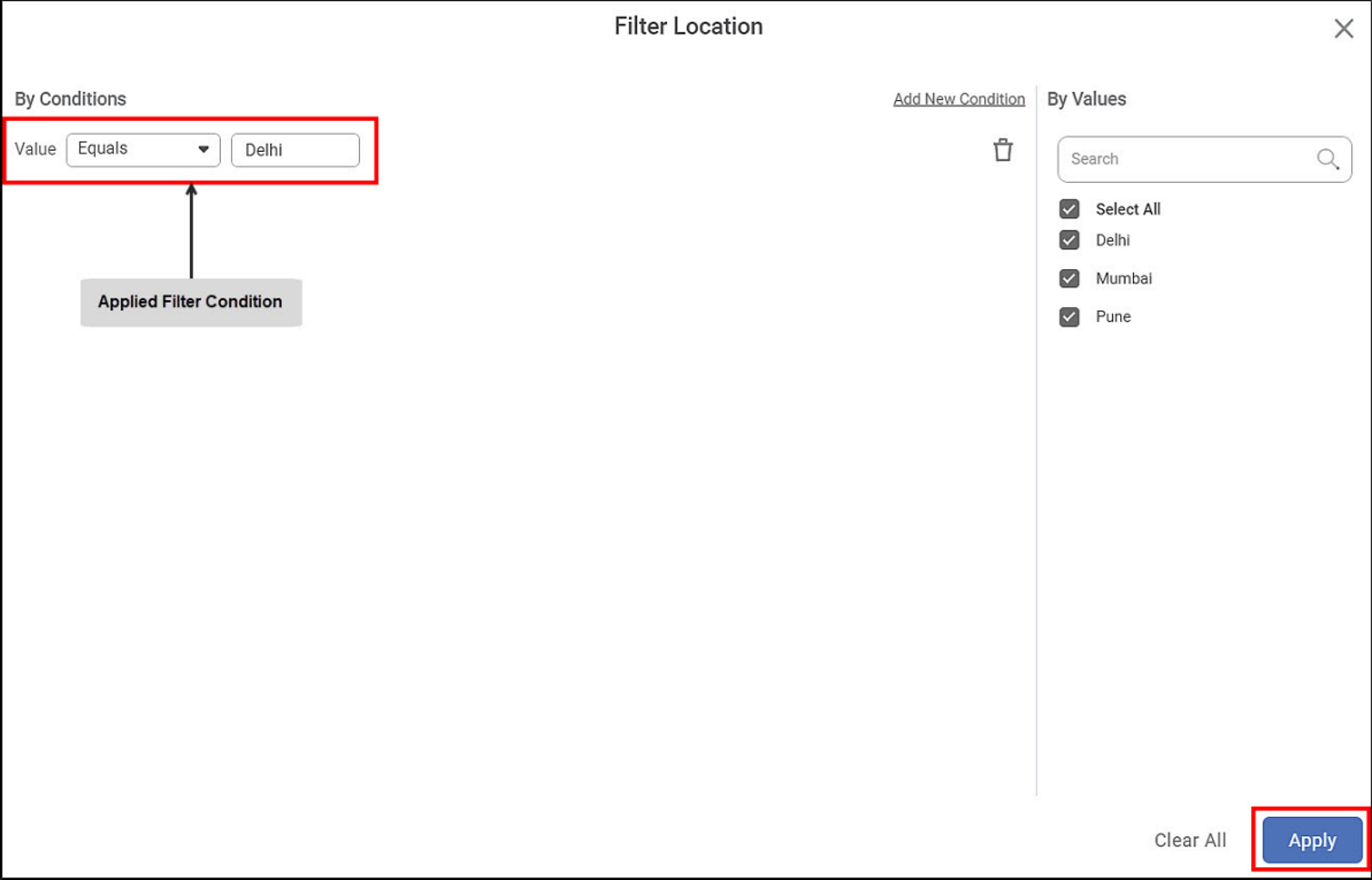 A filtering dialog box is displayed. For example, we apply the filter to Location. - Click Add Condition to view the filtering conditions.