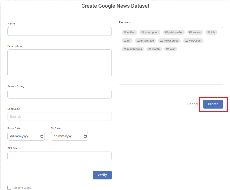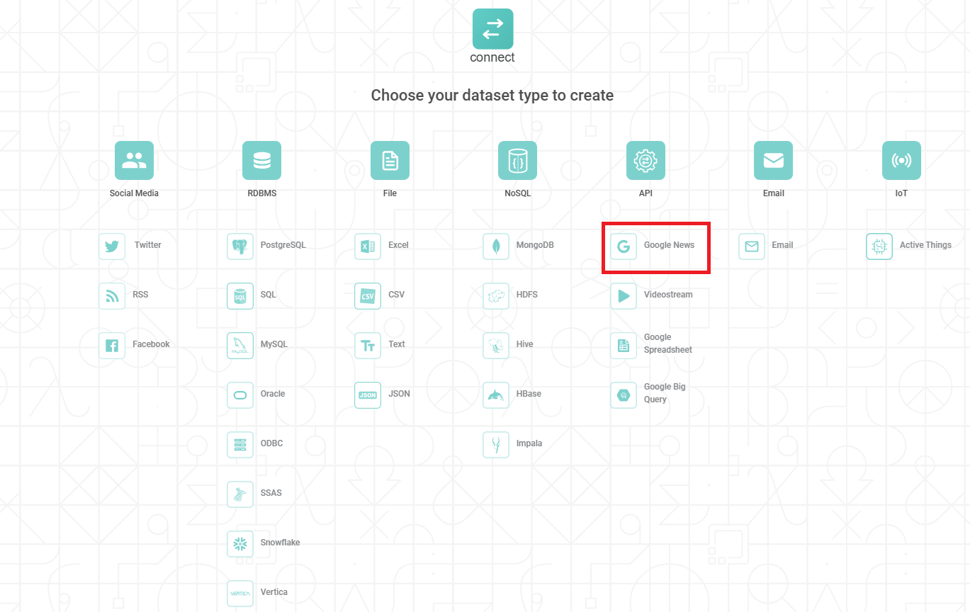 You can create a dataset using the Google News API. Rubiscape fetches data from websites using Google News API based on the search string and time interval provided by you.