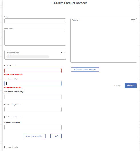 Create Parquet Dataset window is displayed. It displays the following features, which can be inserted along with the existing ones.