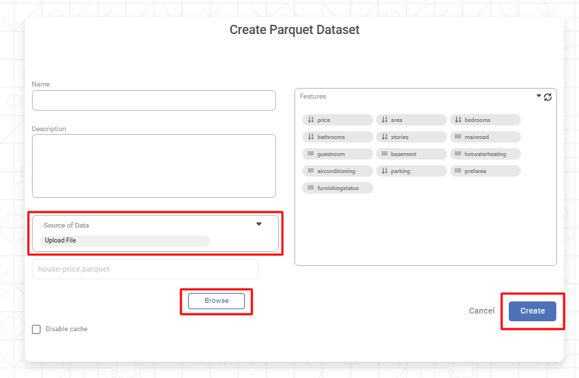 To create a Parquet dataset by uploading a Parquet file from your computer, follow the steps given below.